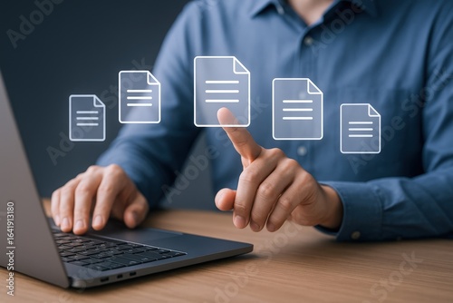 Document Management Concept: Man Interacting with Digital Files on Laptop Screen for Efficient Workflow