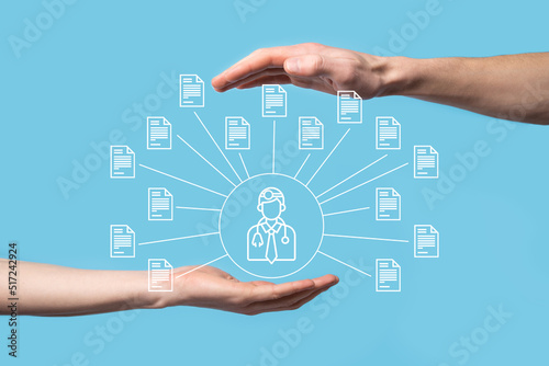 Document Management System DMS .Businessman hold doctor and document icon.Software for archiving, searching and managing corporate files and information.Internet Technology Concept.Digital security.