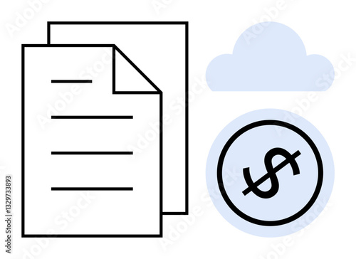 Document pages, cloud symbol, and dollar coin represent online storage, financial management, and digital workflows. Ideal for cloud services, finance, remote work, minimalism automation digital