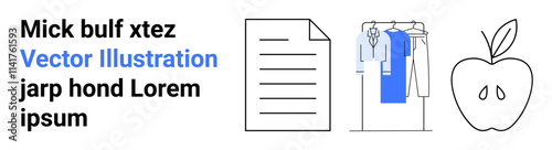 Document with corner folded, clothes rack holding garments, and apple drawing with seeds. Ideal for creative projects, educational materials, fashion design, health and wellness, editorial content