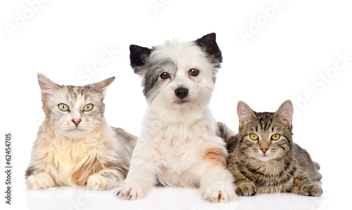 dog and two cats together. isolated on white background