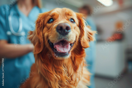 Dog at the veterinary clinic, with a vet in uniform, professional consultation.