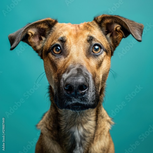 Dog Gazing Directly at the Camera Against a Vibrant Turquoise Blue Background in a Studio Setting Capturing Its Expressive Features