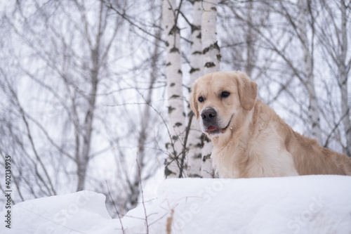 Dog in a snowy winter forest. Golden Retriever stands in a snowdrift against a background of trees. Winter forest covered with snow.