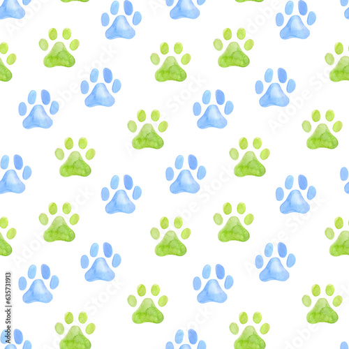 Dog paw seamless pattern. Blue and green puppy or cat paw track. Abstract dog endless animal background