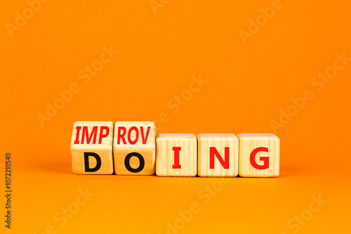 Doing or improving symbol. Turned wooden cubes and changed the word Doing to Improving. Beautiful orange table orange background. Educational business doing or improving concept. Copy space