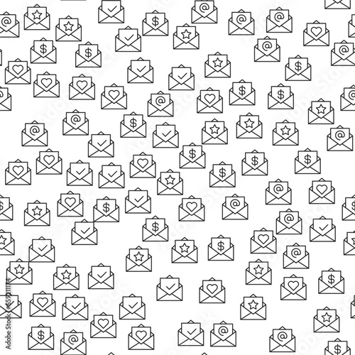 Dollar, Heart, Checkmark, Star on Envelope Seamless Pattern for printing, wrapping, design, sites, shops, apps