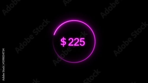 Dollar icon neon bright from $225 magenta color illustration. Black background circle magenta color frem 4k illustration.