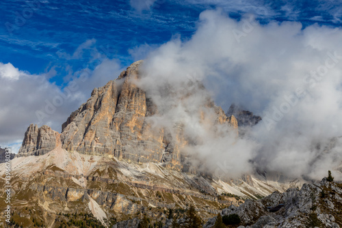 Dolomites mountains, Alpi Dolomiti beautiful scenic landscape in summer. Italian Alps mountain summits and rocky tower peaks above green valley alpine scene near Cortina'd'Amprezzo