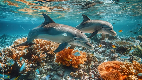 Dolphins weaving through coral and fish, underwater splendor, dynamic, composite, coral atoll backdrop