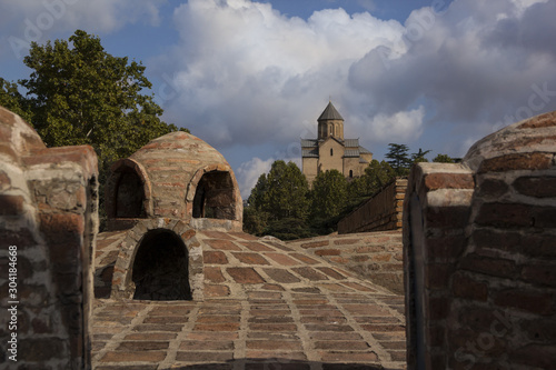 Domes of a Georgian thermal bath and Metekhi Church in Tbilisi, Georgia