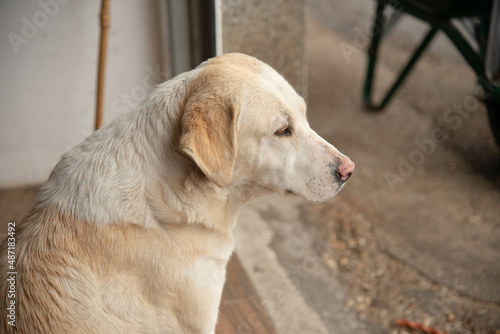 Domestic dog guarding the portal of a house in a border town