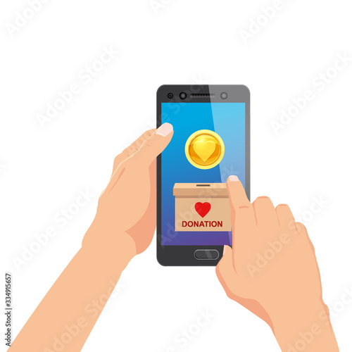 Donating money by online payments consept. Gold coin and donate box button on smartphone screen