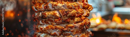 Doner kebab on a vertical rotisserie, thinly sliced meat, busy Turkish market scene
