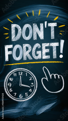 "Don't Forget!" Chalkboard Text with Clock and Finger Pointing for School and Office Reminder, Time Management Concept