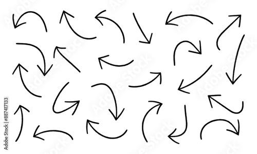 Doodle arrows set. Hand drown lines and curve scribbles. Vector scetch of abstract pointer in different shapes isolated on white background in eps 10.