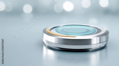 Door entry for smart offices, A sleek, futuristic circular device with metallic edges and a glowing blue center rests on a reflective surface, suggesting advanced technology or a high-tech gadget.