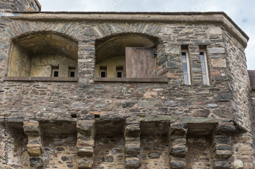 Dornie, Scotland - June 10, 2012: Closeup of gray-stone upper balcony with narrow windows of Eilean Donan Castle. Brown gray rock stone contruction.