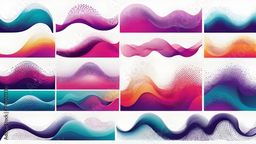 Dotted halftone waves. Abstract liquid shapes, wave effect dotted gradient texture waves isolated vector symbols set. Halftone graphic dots waves