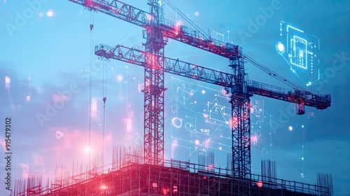 Double exposure image: Construction cranes and digital tech icons, highlighting innovative engineering solutions.