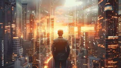 Double exposure image of the businessman standing back during sunrise overlay with cityscape image. The concept of modern life. generative ai