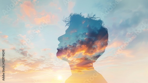 Double exposure of a man's silhouette over a vibrant sunset sky, symbolizing dreams, imagination, and the connection between humanity and nature.