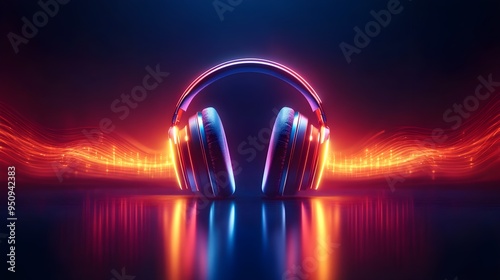 Double exposure of a modern headset with pulsating soundwaves, illustrating next-gen voice control technology, minimalistic design with glowing edges