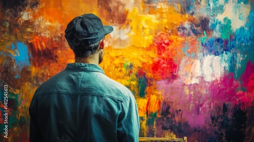 Double exposure of a painter with brush strokes and vibrant colors, expressive artistic mood, blank canvas for text