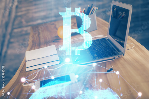 Double exposure of blockchain and crypto economy theme hologram and table with computer background. Concept of bitcoin cryptocurrency.