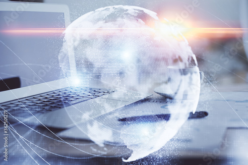 Double exposure of business theme icons and work space with computer background. Concept of success.