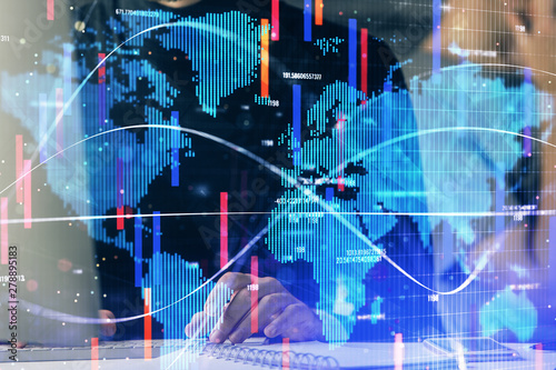 Double exposure of businessman working on laptop on background. International business hologram in front. Concept of success.