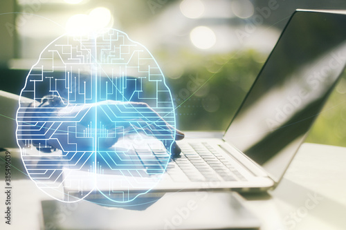 Double exposure of creative artificial Intelligence symbol with hands typing on laptop on background. Neural networks and machine learning concept