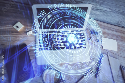 Double exposure of data drawing hologram over topview of study desk background with computer. Concept of Ai.