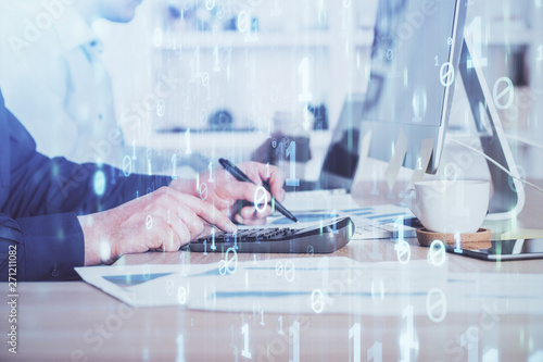 Double exposure of data internet theme hologram with man working on computer on background. Concept of innovation.