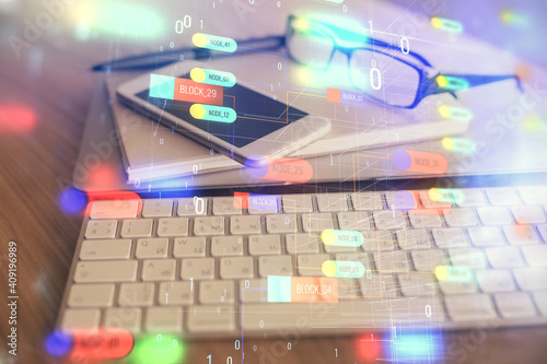 Double exposure of data theme drawing and mobile phone background. Concept of innovation