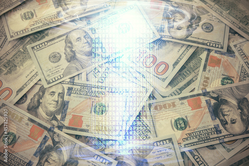 Double exposure of data theme drawing over us dollars bill background. Technology concept.