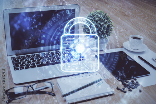Double exposure of desktop with computer and lock icon hologram. Concept of data safety.