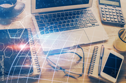 Double exposure of desktop with computer and world map hologram. International data network concept.