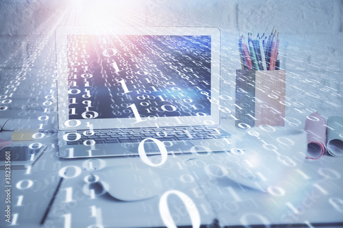 Double exposure of desktop with personal computer on background and tech theme drawing. Concept of Bigdata.