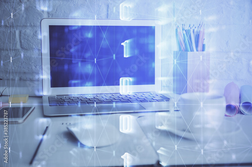 Double exposure of desktop with personal computer on background and tech theme drawing. Concept of Bigdata.