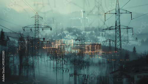 Double exposure of electricity meter and high voltage towers with transmission power lines