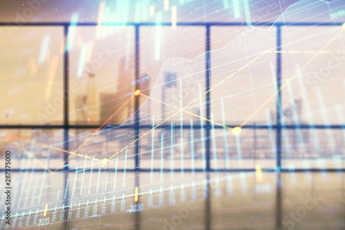 Double exposure of financial chart on empty room interior background. Forex market concept.