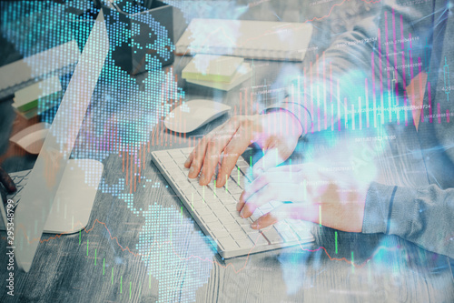 Double exposure of financial graph with man works in office on background. Concept of analysis.