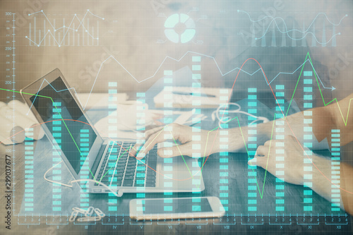 Double exposure of forex chart with man working on computer on background. Concept of market analysis.