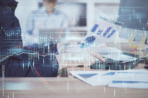 Double exposure of graph with man typing on computer in office on background. Concept of hard work. Closeup.