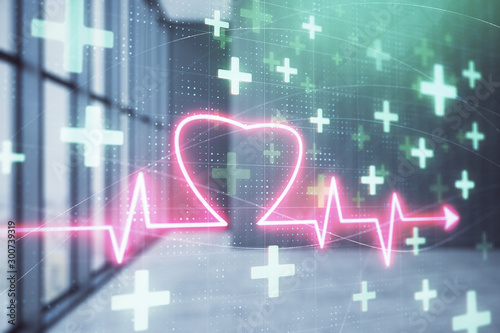 Double exposure of heart drawing hologram on empty room interior background. Medical education concept.