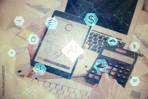 Double exposure of man's hand holding and using a digital device and data theme hologram drawing. Technology concept.