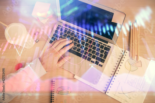 Double exposure of man's hands typing over computer keyboard and forex graph hologram drawing. Top view. Financial markets concept.