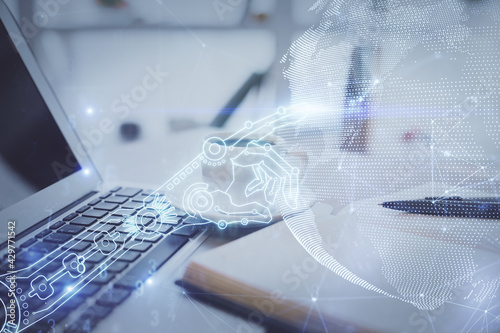 Double exposure of technology theme drawing and desktop with coffee and items on table background. Concept of high tech.
