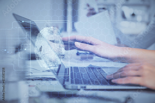 Double exposure of woman hands typing on computer and fingerprint drawing. Security concept.